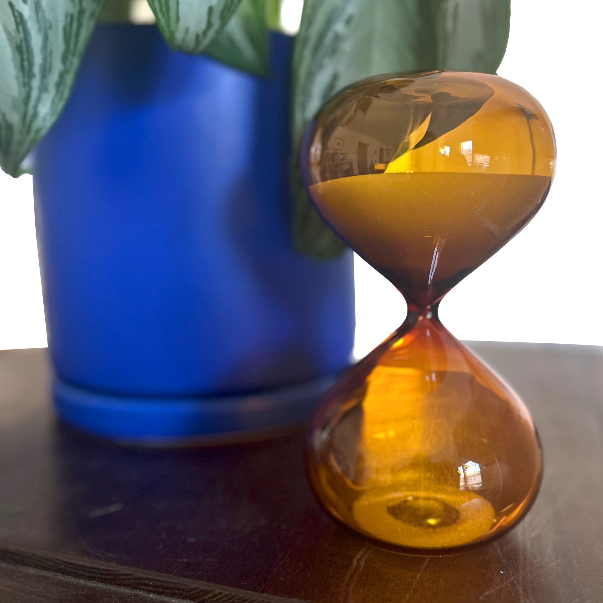 This handmade glass hourglass adds a concrete yet functional quality to any desk or workspace. The hourglass is amber and runs for 30-minutes.