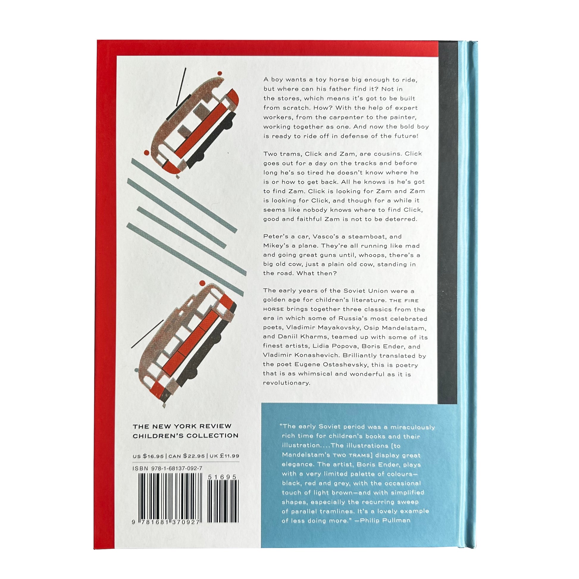 The early years of the Soviet Union were a golden age for children’s literature. The Fire Horse brings together three classics from the era in which some of Russia’s most celebrated poets, Vladimir Mayakovsky, Osip Mandelstam, and Daniil Kharms, teamed up with some of its finest artists, Lidia Popova, Boris Ender, and Vladimir Konashevich. Brilliantly translated by the poet Eugene Ostashevsky, this is poetry that is as whimsical and wonderful as it is revolutionary.